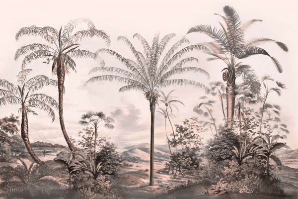 Med sina djärva svart- och gråtoner utgör denna design ett iögonfallande tropiskt panorama som känns både modernt och tidlöst. Palmerna verkar stå i silhuett mot en subtil, skymningshorizont, vilket ger en fascinerande och konstnärlig utstrålning. Detta mönster är perfekt för interiörer som älskar kontraster och en touch av drama. I en chic, minimalistisk miljö med släta vita väggar och metalliska accenter får denna design chansen att verkligen lysa. I en industriell eller loftliknande miljö kan du kombinera det med betong, läder eller mörka träslag för en tuff, edgy atmosfär. De mörka färgerna ger en lyxig och mystisk känsla, vilket gör denna design ytterst lämplig för exempelvis ett stiligt vardagsrum eller ett master bedroom. Genom att avsluta med varm belysning, sammetskuddar och några gröna växter skapar du en raffinerad och ändå inbjudande helhet. Så tar du den tropiska natten inomhus, med all den allure som hör därtill.