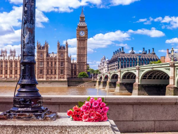 Rosa rosor i London. Big Ben syns i bakgrunden.
