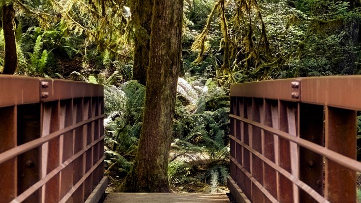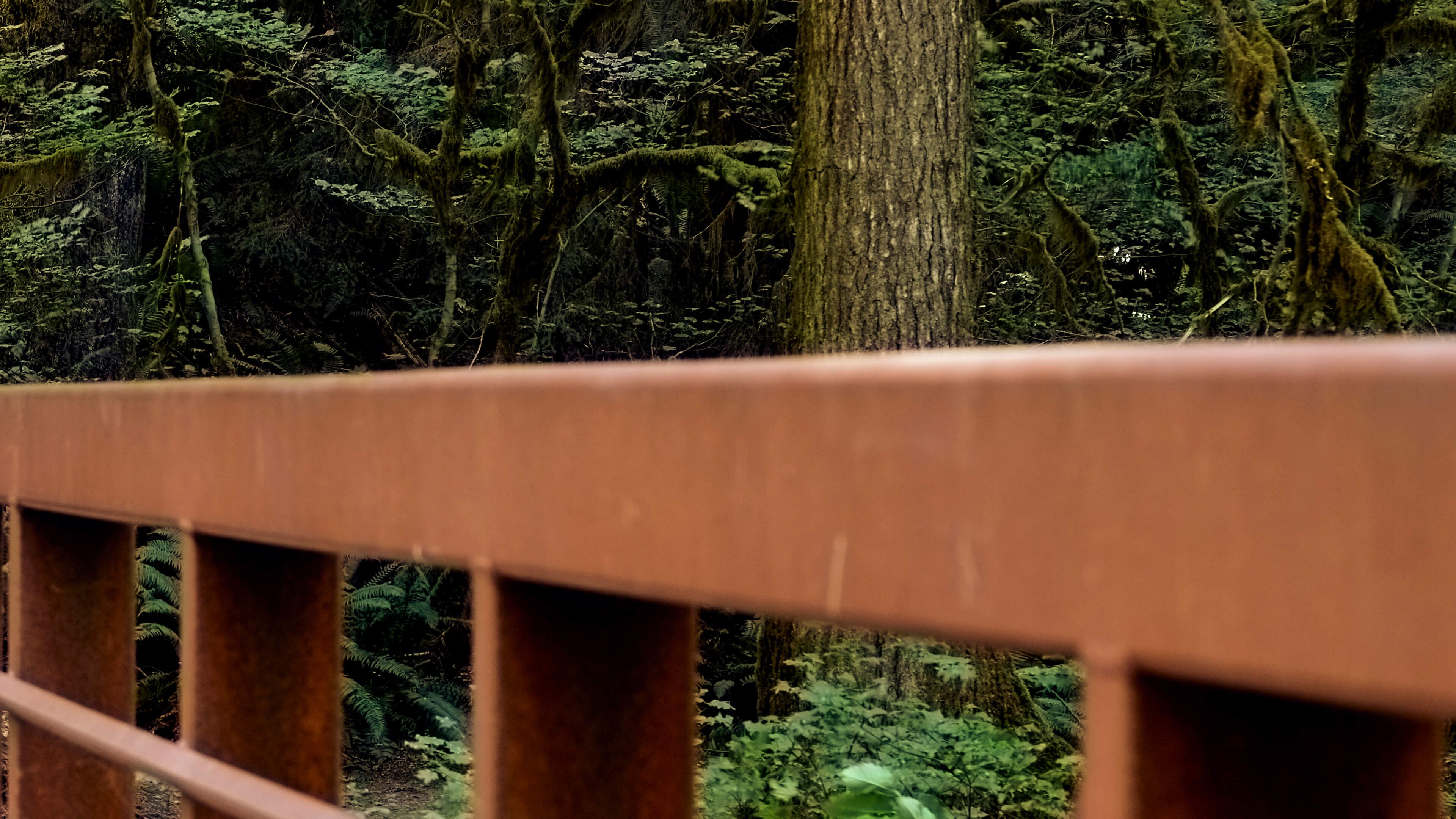 Trevlig bild av en stålbro mitt i skogen