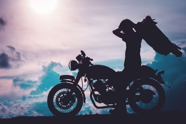 Silhuett av en motorcyklist med sin cykel. I bakgrunden en fin sol. En känsla av frihet.