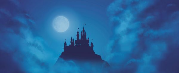 Ett slott i månsken på ett berg. Molnen som hänger framför berget gör att slottet ser mystiskt ut.