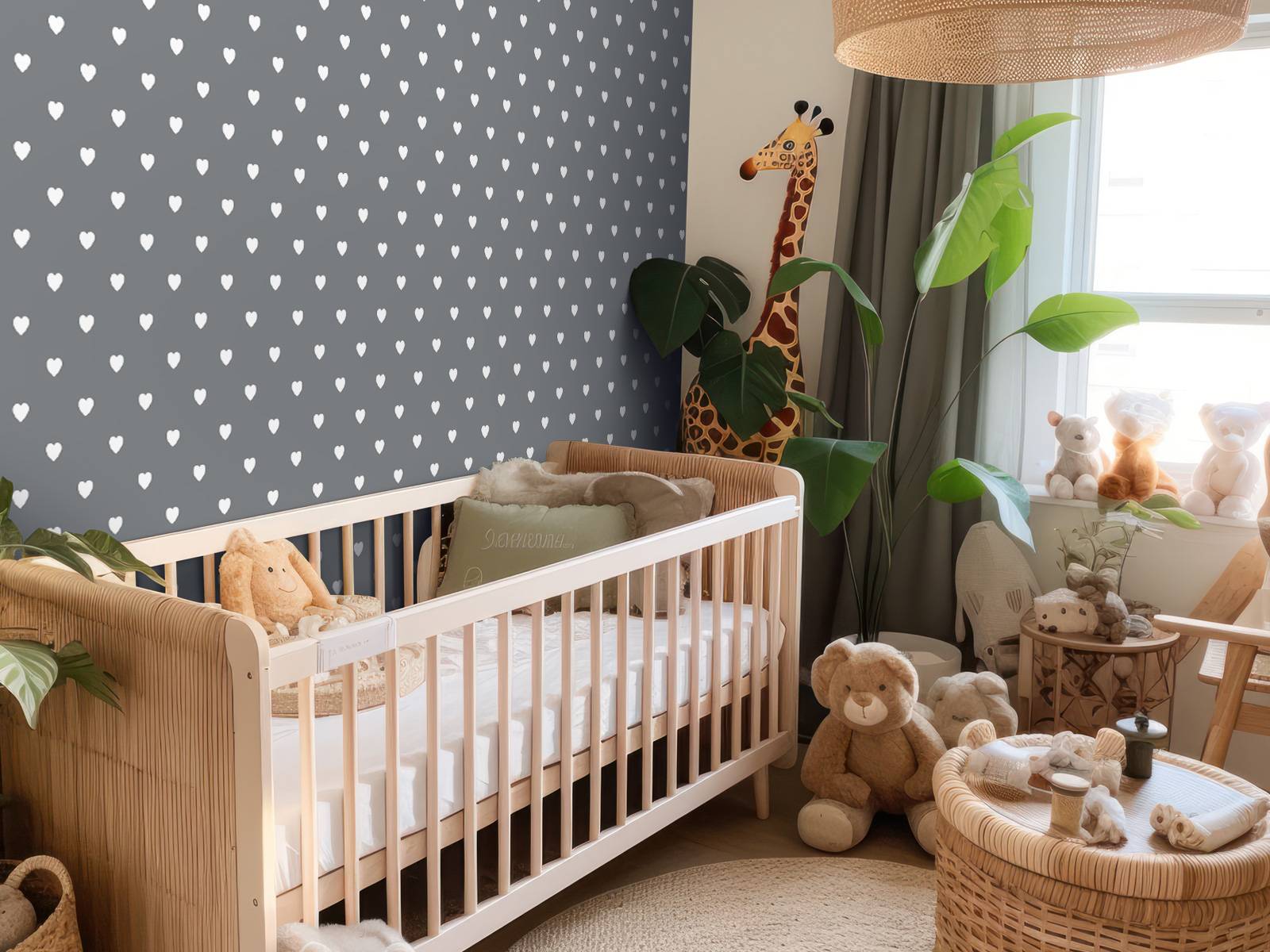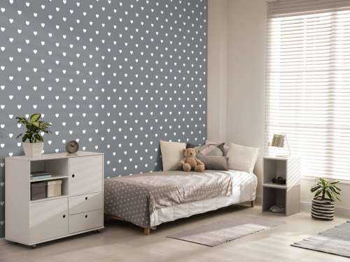 Wandkleed met een kleine witte hartjes op een lichtgrijze achtergrond