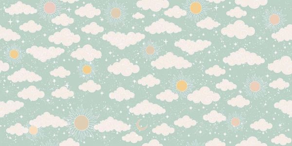 Ett lekfullt himmelsmönster med mjuka moln, solar, månar och glittrande stjärnor i pastell på en mintgrön bakgrund. Designen utstrålar lugn, vänlighet och fantasi.