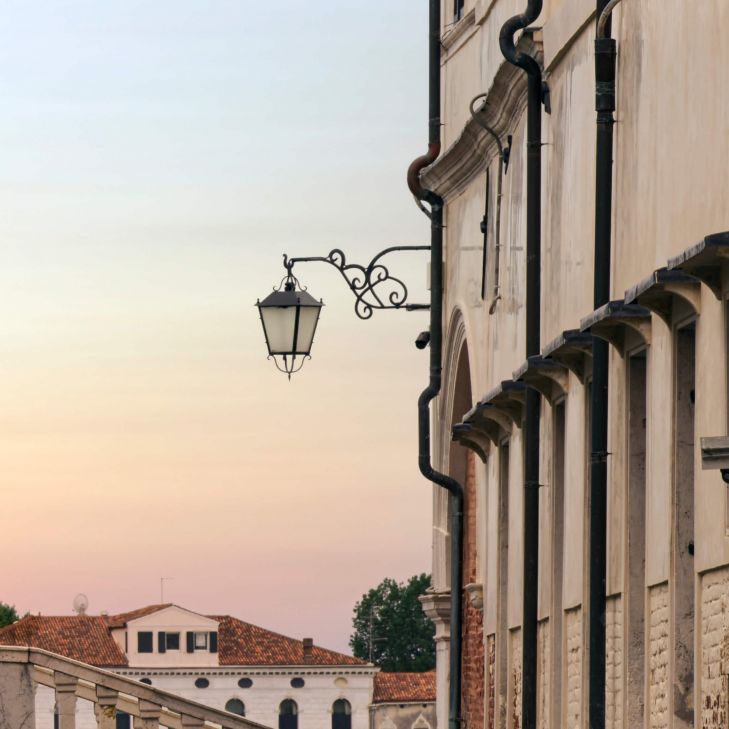 En vacker solnedgång i Venedig med ett gammalt räcke till vänster som leder till bron.