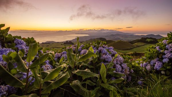 Fototapet av en solnedgång i Portugal med lila hortensior. Kombinera detta i matsalen.