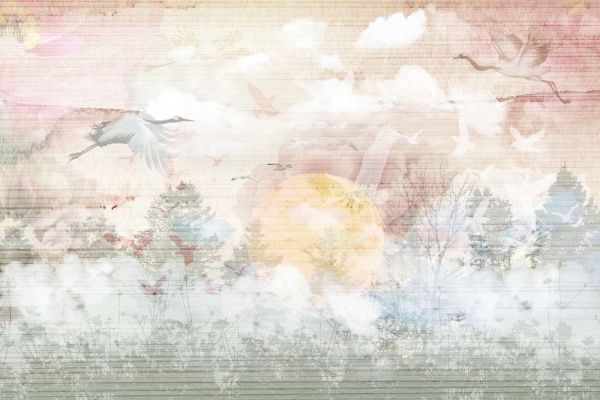 Ett eteriskt design där fåglar sväva över ett dimmigt landskap vid soluppgången. De mjuka pastellfärgerna och subtila detaljer skapar en drömlik och lugnande atmosfär, perfekt för en seren utstrålning.
