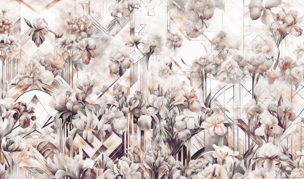 Ett raffinerat design där eleganta irisar och pioner smälter samman med geometriska Art Deco-element. De varma sepia- och crème nyanser ger helheten en nostalgisk, elegant känsla. Den subtila akvarelltekniken och mjuka färgövergångarna skapar en harmonisk och tidlös design.