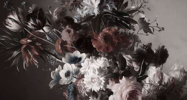 Ditt imponerande blomstermotiv fångar atmosfären av en klassisk stilleben, med en rik komposition av tulpaner, rosor, anemoner och andra förfinade blommor. De djupa nyanser av rostbrunt, nattblått och elfenben accentueras av en skuggig bakgrund, vilket ger blommorna en nästan påtaglig djup. De dämpade färgerna och den dramatiska ljussättningen ger denna design en barock, tidlös känsla som både känns lyxig och mystisk. I en klassisk inredning passar denna design perfekt med mörka träslag, sammetsmöbler och gyllene eller bronsaccentuerade detaljer. Den väcker storheten hos gamla mästare och tillför ett konstnärligt uttalande till rummet. I en modern inredning kan detta mönster skapa en kraftfull kontrast med strikta linjer och minimalistiska möbler, vilket ger en djärv och stilren effekt. Denna design kommer vackert till sin rätt i utrymmen med en intim och lyxig atmosfär, som ett chic vardagsrum, en elegant matsal eller ett förfinat sovrum. Även i exklusiva hotell, restauranger och butiker kan detta mönster skapa en dramatisk och förfinad stämning. Med sina djupa färger och klassiska komposition ger denna design en känsla av rikedom och elegans i varje rum. Det är ett tidlöst val för älskare av konstnärliga, stämningsfulla interiörer med en touch av dramatik.