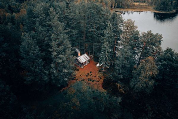 Stuga omgiven av skog och sjöar