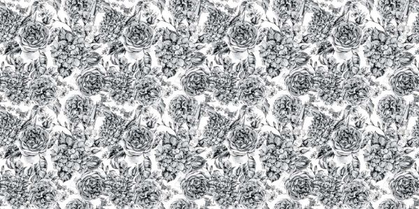 Denna design fångar essensen av en monokrom trädgård, med ett utbud av blommor och blad i gråskalor. De storslagna rosorna och subtila hortensiorna är framställda i fina, detaljerade skisser, vilket skapar en klassisk och tidlös elegans.