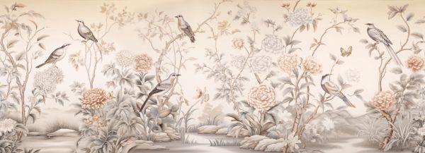 Denna design återspeglar ett mjukt, nästan drömskt landskap där eleganta sångfåglar blandas med ett överflöd av blommande krysantemum och annan flora.