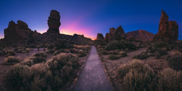 En gångväg genom en naturreservat på Teneriffa. Solen har precis gått ned.
