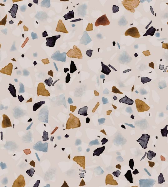 Ett abstrakt mönster inspirerat av terrazzo, med organiska fragment i varma guld- och jordtoner, djupblått och svart. Den mjuka bakgrunden ger balans och skapar en modern, sofistikerad känsla.