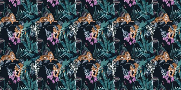 Tropiskt mönster med tigrar, blad och blommor på en svart bakgrund.