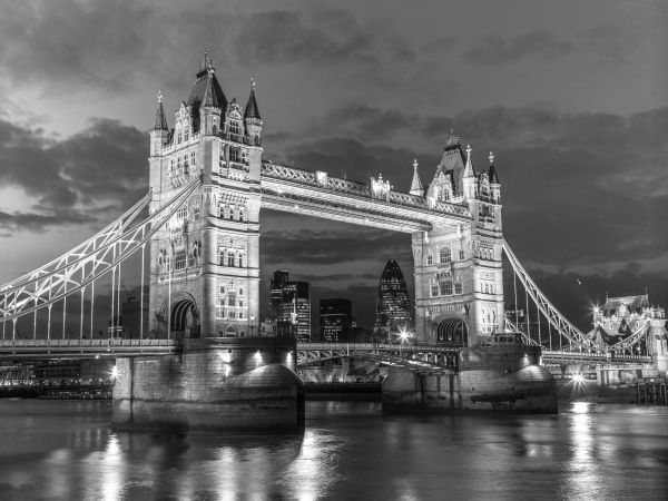 Detta fotografi fångar Tower Bridge i ett stillsamt ögonblick, där dess upplysta konturer sticker ut mot kvällshimlen. Reflektionen i vattnet fördubblar byggnadens majestät, medan den moderna skylinen i bakgrunden är en subtil påminnelse om dess oupphörliga framsteg. Den monokroma färgsättningen förstärker känslan av ståtlighet och kontinuitet.