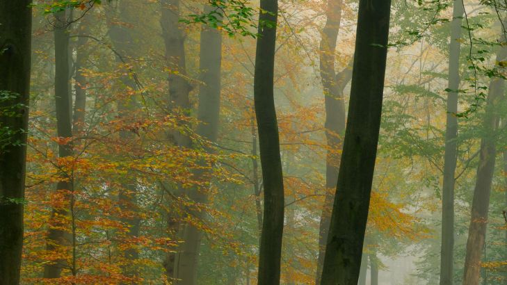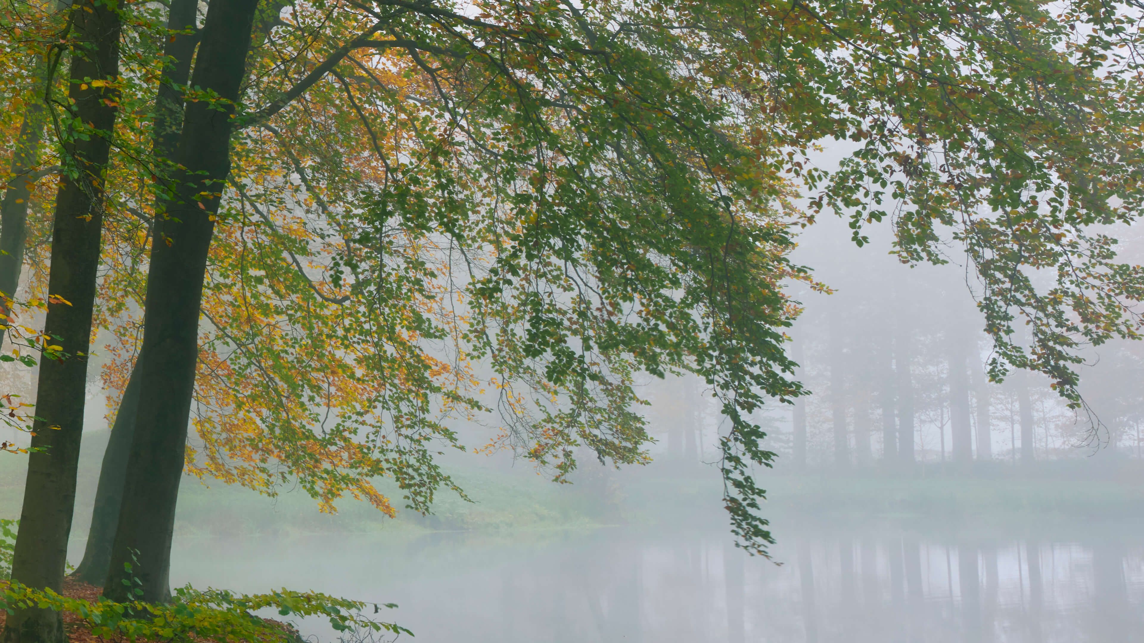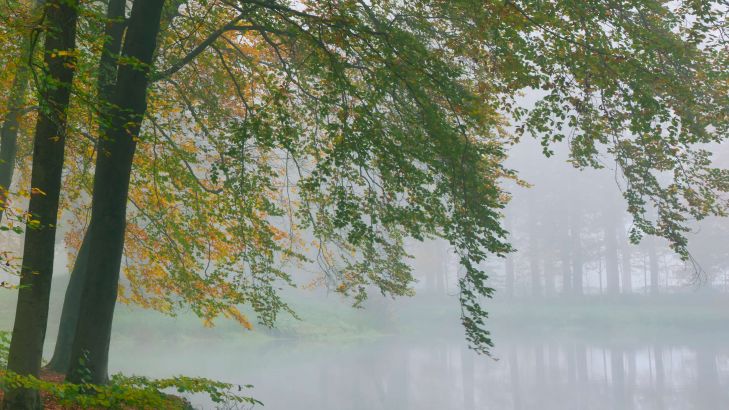 Vacker reflektion av träd i en damm. En dimma hänger över vattnet och ser mystisk ut.