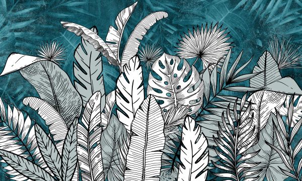 Tecknade tropiska blad på en petrolfärgad betongbakgrund.