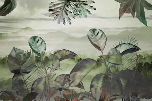Akvarellerat djungellandskap med olika blad och grenar i förgrunden.