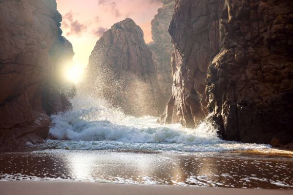 Wandkleed van woeste golven die tegen rotsen slaan met tussen de rotsen door een ondergaande zon