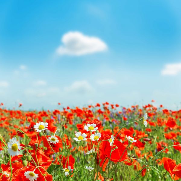 Ett vackert fält fullt av röda vallmor och vita prästkragar med en klarblå himmel i bakgrunden.