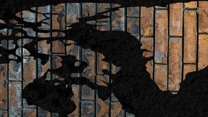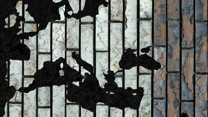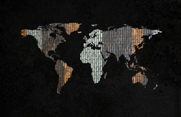 Världskarta med vertikala färgade tegelstenar. Den svarta bakgrunden får världskartan att framträda tydligt.