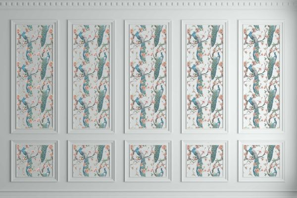 Graciösa påfåglar visar upp sig bland rosa blommor mot en ljus bakgrund, en symfoni av natur och elegans.