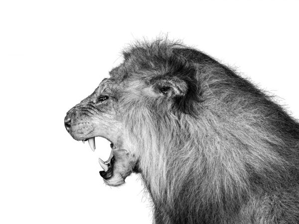 Den här svartvita bilden visar ett lejons kraftfulla rytande, med utsökta detaljer i den vilda manen och de imponerande tänderna. Den minimalistiska bakgrunden framhäver lejonets kungliga och otämjda natur och utstrålar en känsla av ren makt och dominans.