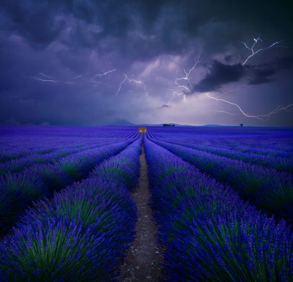 Wetter im Lavendelfield på fototapeter. Åskväder över lavendelfält för en spektakulär bild.